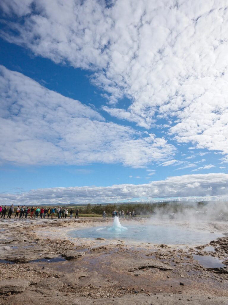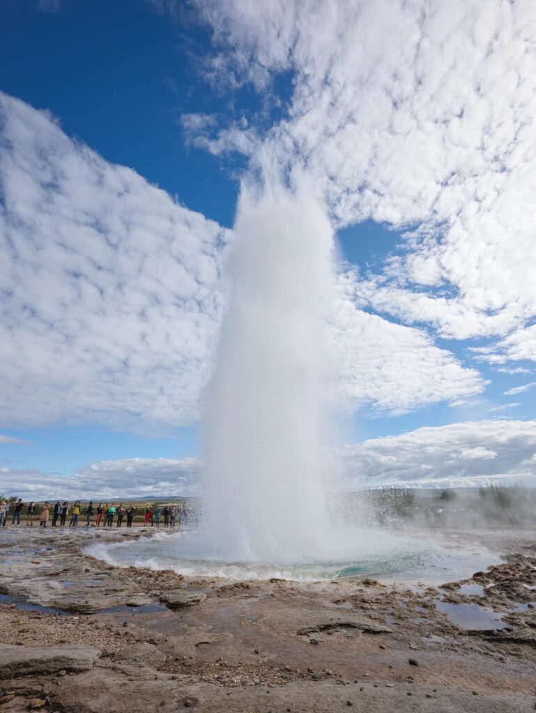 The Geysir geothermal field is home to Strokkur, one of Iceland’s most active geysers, which erupts every 5 to 10 minutes, shooting a water column 20–30 meters (65–100 feet) into the air. The area also features steaming hot springs, bubbling mud pools, and fumaroles, demonstrating the powerful geothermal activity beneath Iceland’s surface.