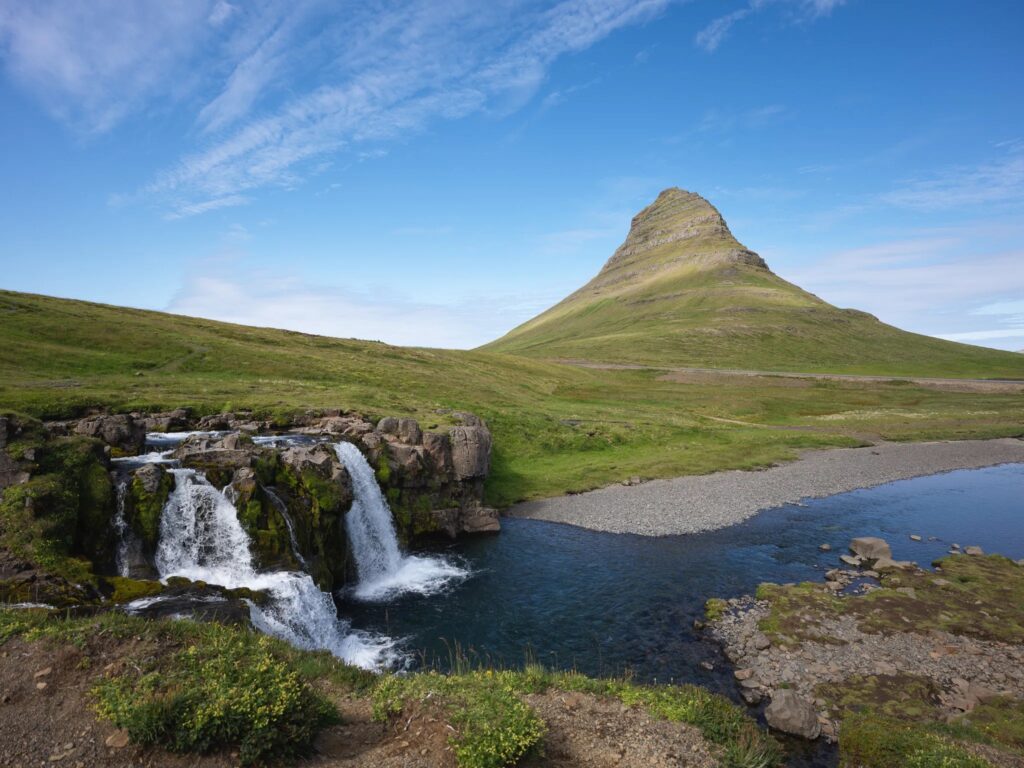 Kirkjufell (“Church Mountain”) is Iceland’s most photographed mountain, standing at 463 meters (1,519 feet). Its distinctive pyramid-like shape makes it a favorite for photographers and nature lovers alike. Nearby, the Kirkjufellsfoss waterfall provides the perfect foreground for stunning landscape shots, making this a must-visit location.