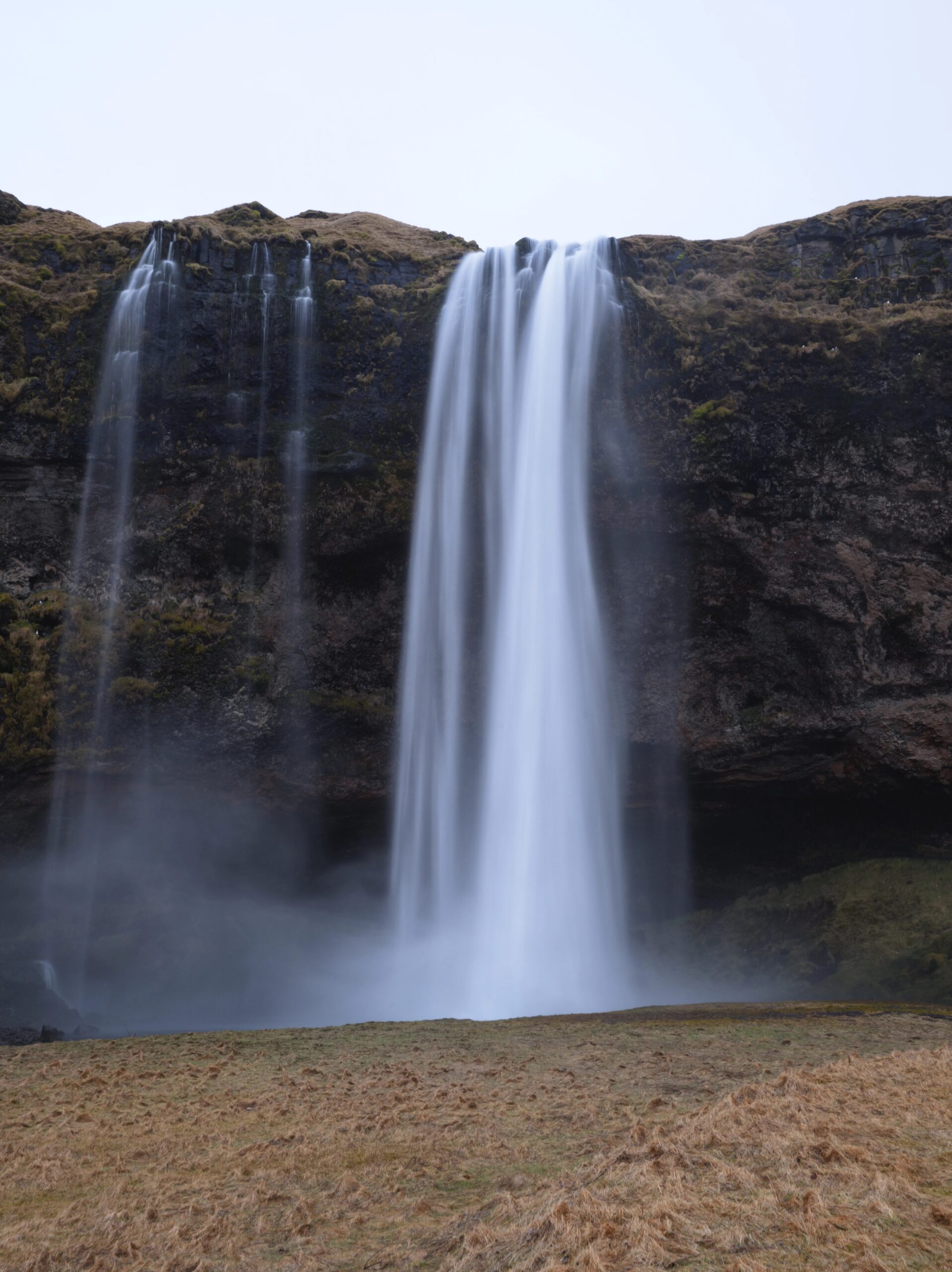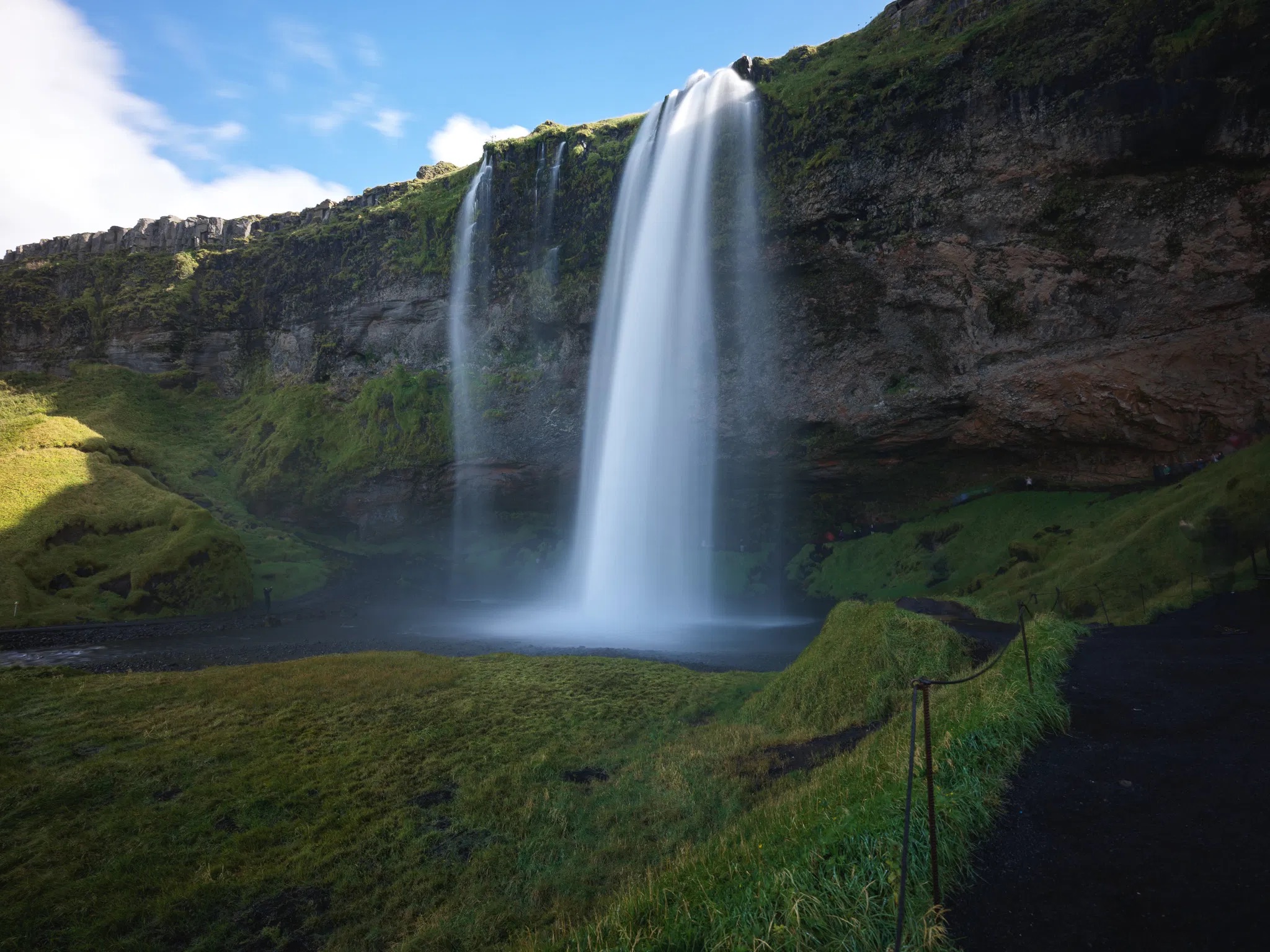 One of Iceland’s most famous waterfalls, Seljalandsfoss cascades 60 meters (197 feet) from a former sea cliff. Its unique feature is a walking path behind the waterfall, offering a rare opportunity to experience the power of nature from within. During winter, the path may be icy, requiring extra caution.