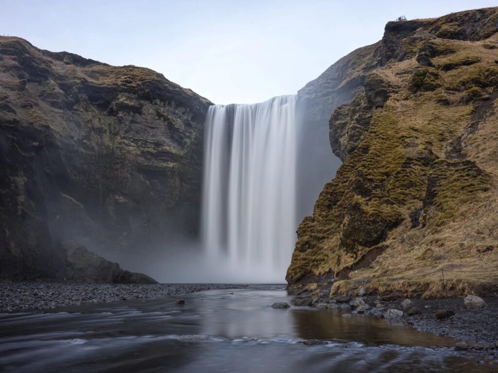 One of Iceland’s largest and most powerful waterfalls, Skógafoss has a 25-meter (82-foot) width and a 60-meter (197-foot) drop. On sunny days, the mist from the waterfall often creates a double rainbow, adding to its dramatic beauty. Visitors can climb the staircase alongside the waterfall for panoramic views of the surrounding coastline and glaciers.
